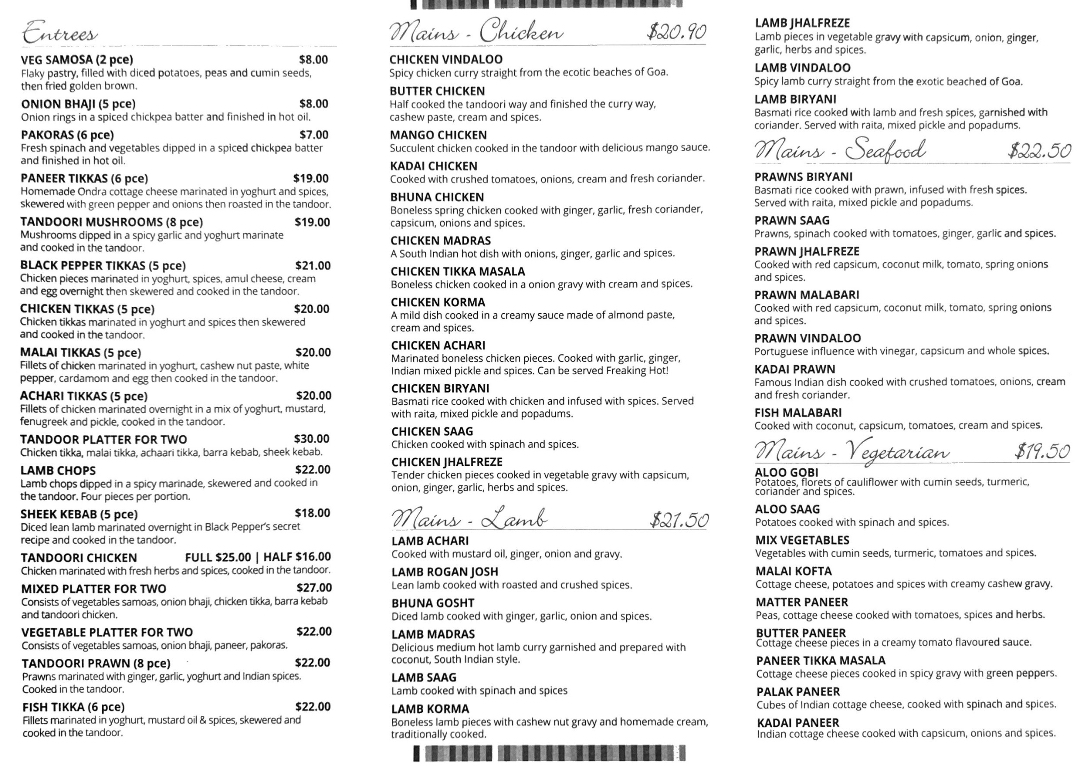 Located at 6 Factory Road, Mosgiel, Black Pepper offers a tantalizing journey through Indian cuisine. The menu features an array of dishes that celebrate bold flavors and culinary traditions. For vegetarians, classics like Palak Paneer and Chana Masala shine with rich spices, while the Vegetarian Biryani serves as a fragrant highlight. Seafood lovers can indulge in an exquisite selection, including the Prawn Vindaloo and Kadai Prawn, each prepared with fresh, vibrant ingredients.